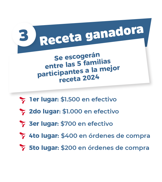 En el transcurso de todo el concurso Mi Receta Preferida 2023, se realizará el sorteo de más de $50.000 en premios varios, incluido en el valor los premios del equipo ganador, equipo segundo lugar y ganador de Mi Receta Preferida 2023.